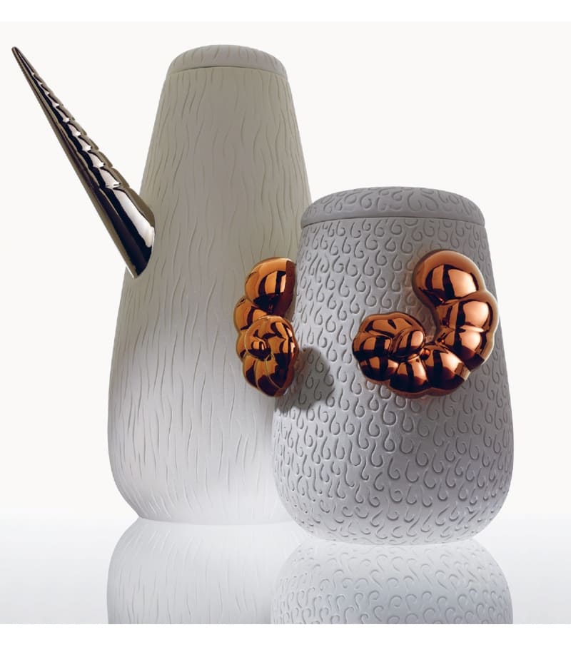 Die Keramikproduktion von Bosa verbindet traditionelle Fertigungstechniken mit innovativen Präzisionstechniken. Jede Vase und jeder Kerzenhalter wird durch die Veredelung mit Edelmetallen wie Gold, Platin oder Kupfer zu einem einzigartigen Kunstobjekt. Die außergewöhnliche Farbpalette und die von Nika Zupanc und Marco Morosini entwickelten Designs machen jedes Stück zu einem Statement zeitgenössischer Keramikkunst.