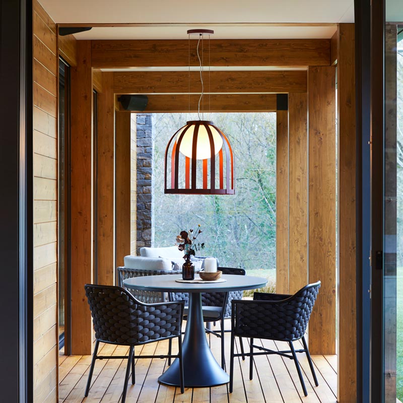 Die Bols T-4024X Pendelleuchte von Estiluz, entworfen vom spanischen Designstudio Mermelada Estudio, kombiniert modernes Design mit funktionaler Eleganz und ist sowohl für den Innen- als auch den Außenbereich geeignet. Mit ihrem markanten, käfigartigen Schirm aus pulverbeschichtetem Aluminium und einem zentralen Diffusor aus Polyethylen erzeugt sie ein warmes, atmosphärisches Licht, das sich ideal für Terrassen, Veranden oder stilvolle Innenräume eignet.