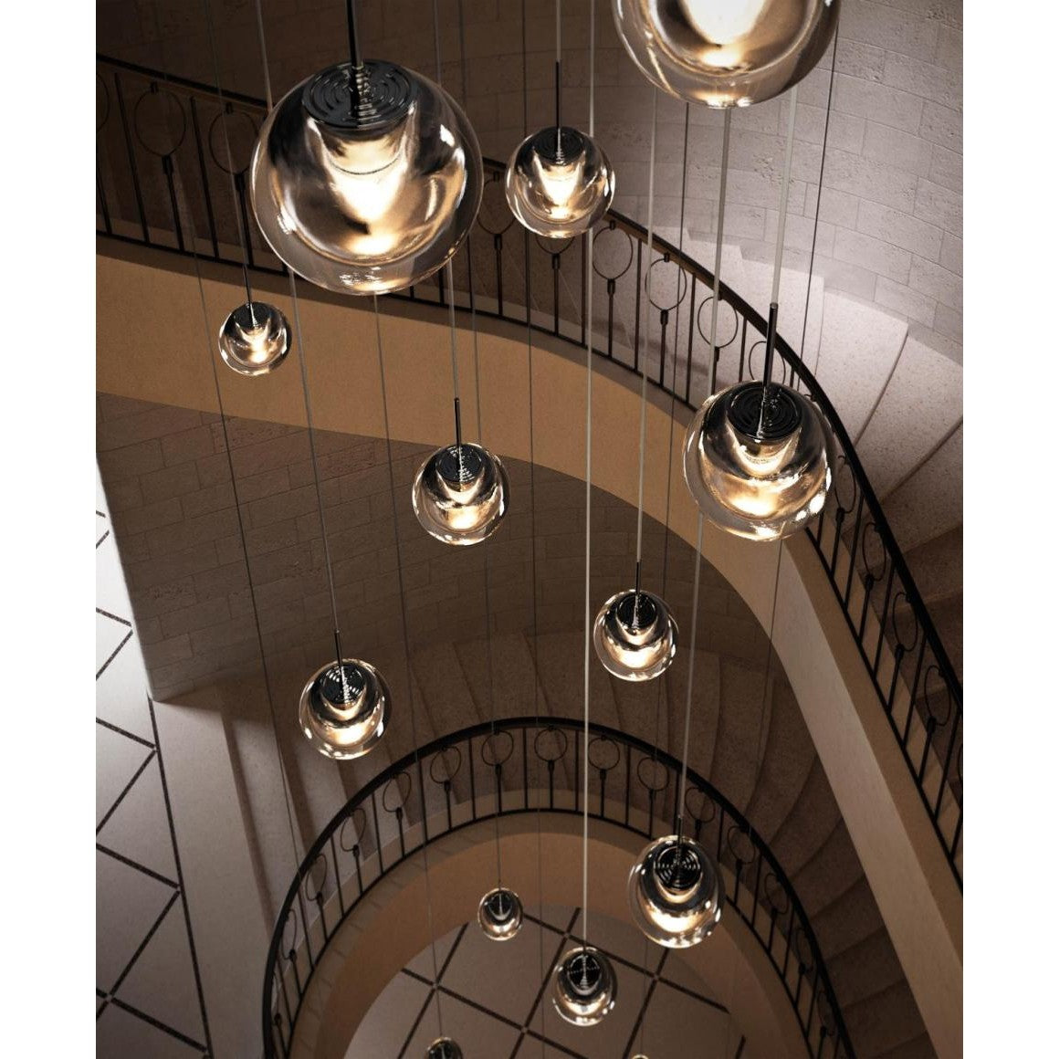 Die Dew Pendelleuchte 5er-Set von Kundalini (KDLN) verbindet poetische Eleganz mit innovativer LED-Technologie. Entworfen von Emmanuel Babled im Jahr 2009, setzt diese tautropfenförmige Leuchtenskulptur besondere Akzente über Esstischen, in Eingangsbereichen oder Treppenaufgängen. Die Kombination aus massiver Glaskugel und integriertem Aluminium-Kühlkörper macht sie zu einem energieeffizienten und zeitlosen Designobjekt.
