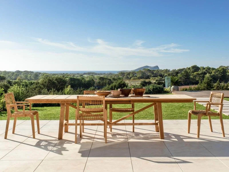 Die Synthesis Essgruppe von Unopiù vereint elegantes Design und Funktionalität für Ihren Außenbereich. Diese Gruppe, bestehend aus einem rechteckigen, ausziehbaren Tisch und einer Kombination aus Stühlen und Armstühlen, ist vollständig aus hochwertigem Teakholz gefertigt und bietet eine robuste sowie ästhetisch ansprechende Lösung für gemeinsame Mahlzeiten im Freien.
